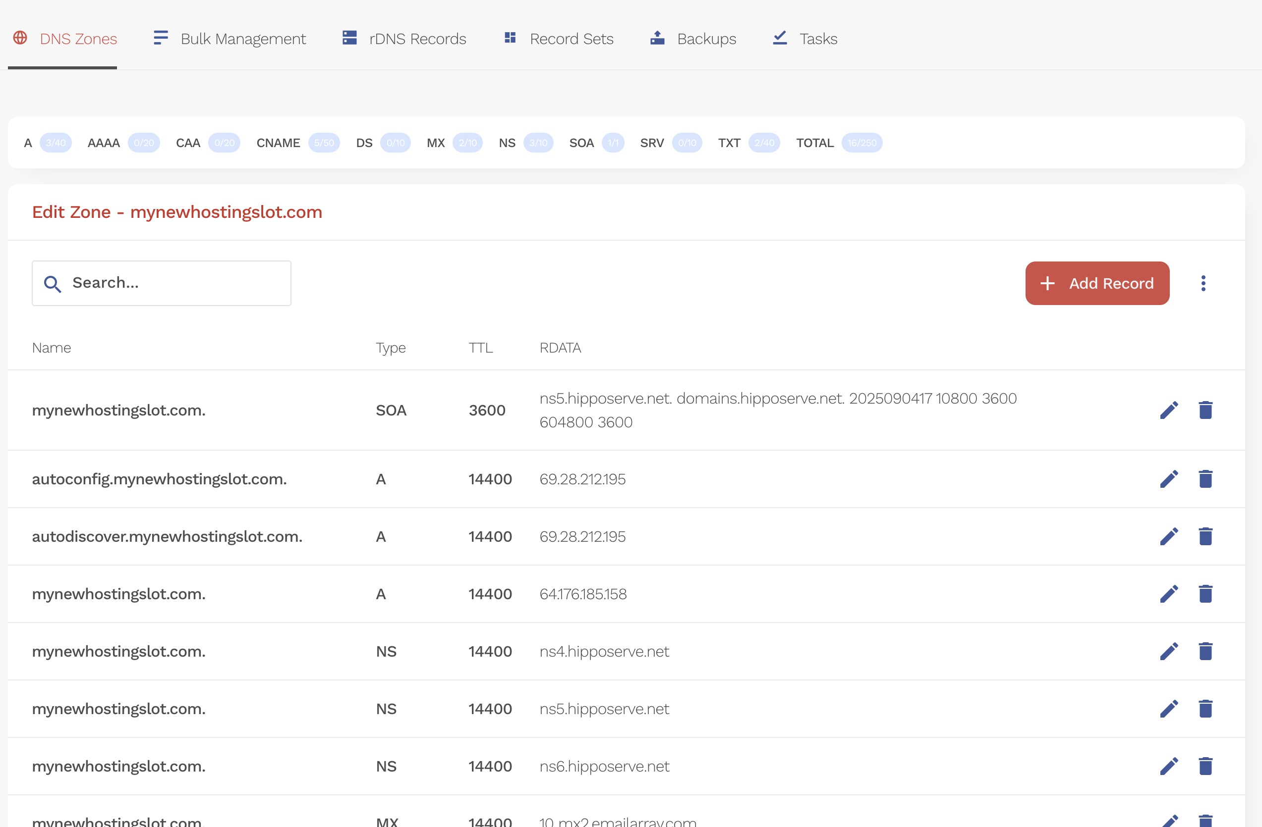 Kjo do të hapë regjistrat e DNS për slotin e zgjedhur, ku mund të shtoni, modifikoni ose fshini të dhëna.