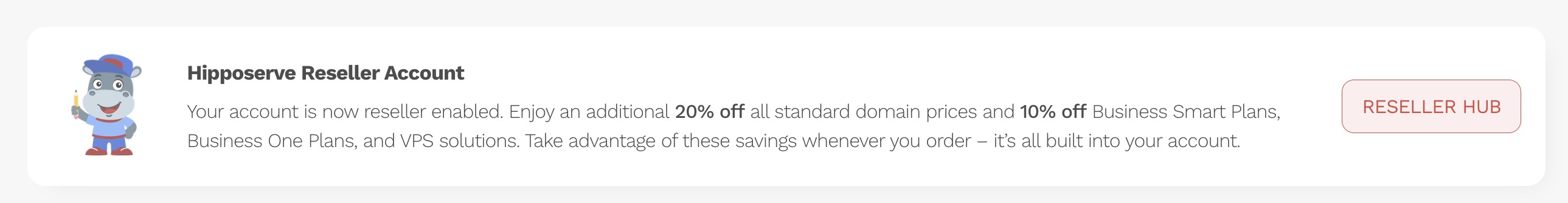 As soon as you purchase your first Reseller Pack, your account will be upgraded to a reseller account. This not only gives you access to the Reseller Hub, but also unlocks additional discounts on all domain purchases and a range of other Hipposerve products.